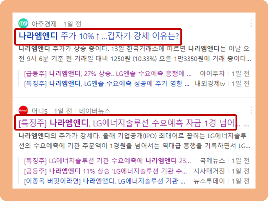 이 소식이 발표되면서, LG에너지솔루션이 나라엠앤디의 2대 주주로 있다는 사실이 부각되어 관심이 몰리고 있는 것입니다.