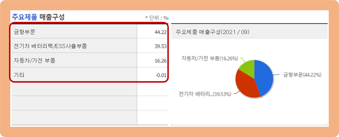 그 다음으로 전기차 배터리팩부문이 약 39.53%, 자동처 및 가전 부품이 약 16.26% 수준이네요.