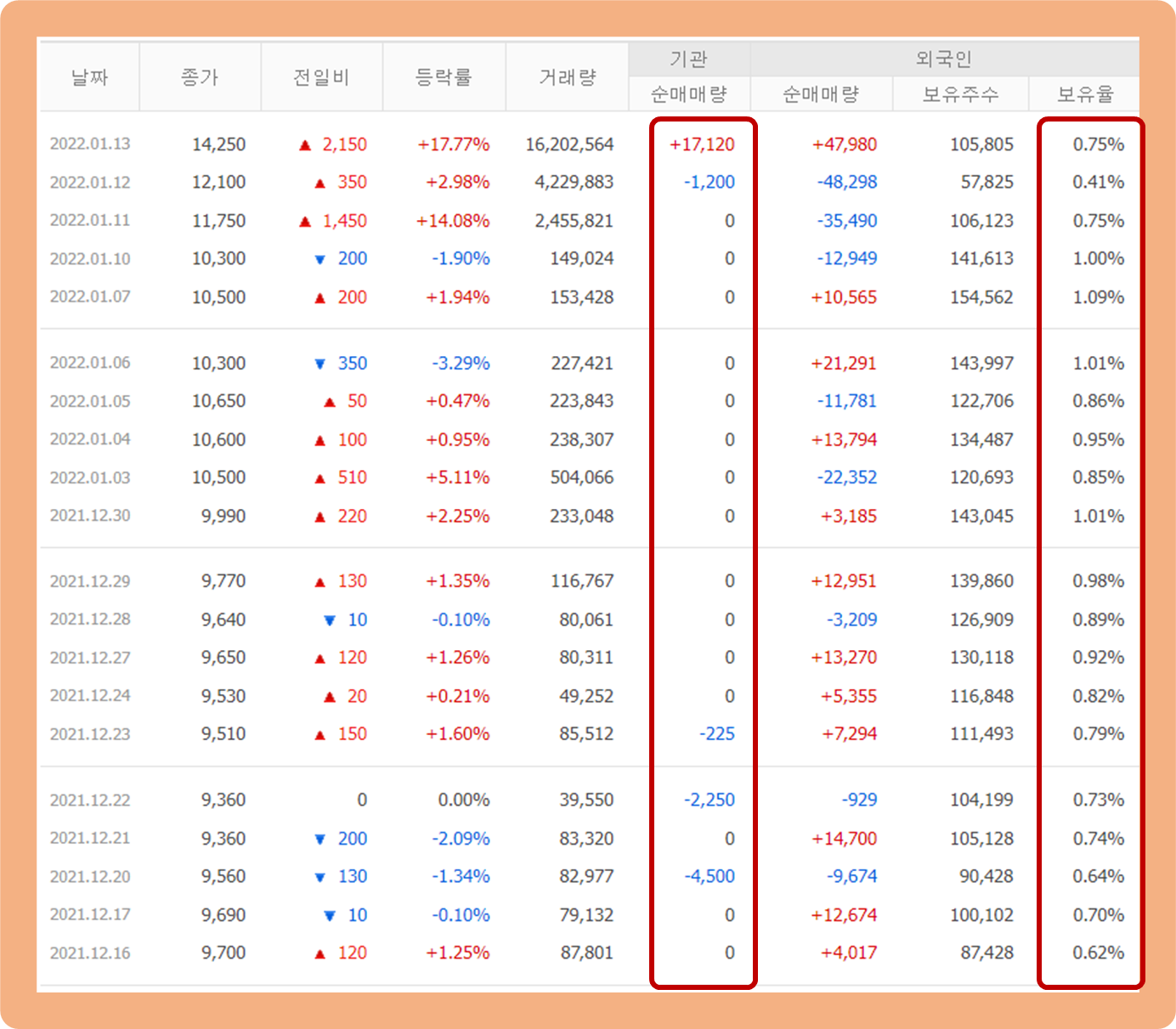 기관투자자의 경우 지난 한 달 간 거래량이 거의 없었는데, 지난 1월 13일 LG에너지솔루션 수요예측 흥행으로 인해 매수세가 대거 유입되었구요.