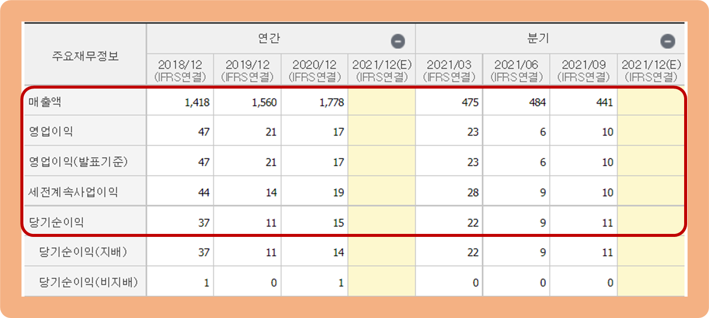 그리고 2021년 3분기 누적 기준 영업이익과 당기순이익은 이미 각 49억원, 42억원을 기록하고 있는 바, 2021년 연간 실적은 호실적으로 돌아설 것으로 보입니다.