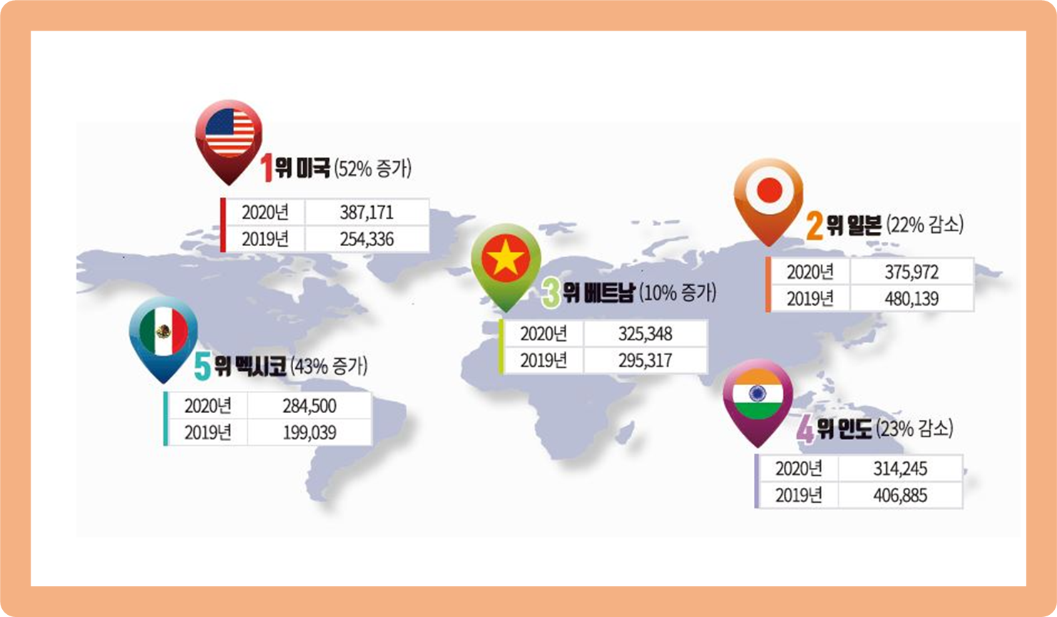 1위 : 미국, 2위 : 일본, 3위 : 베트남, 4위 : 인도, 5위 : 멕시코 순입니다.