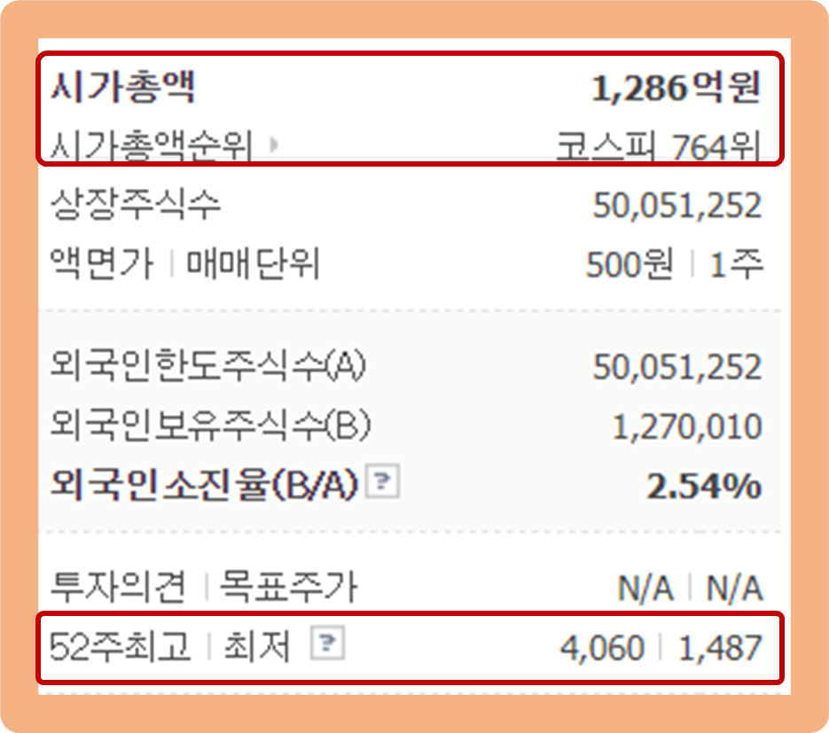 52주 최고가는 4,060원이며, 52주 최저가는 1,487원이네요.