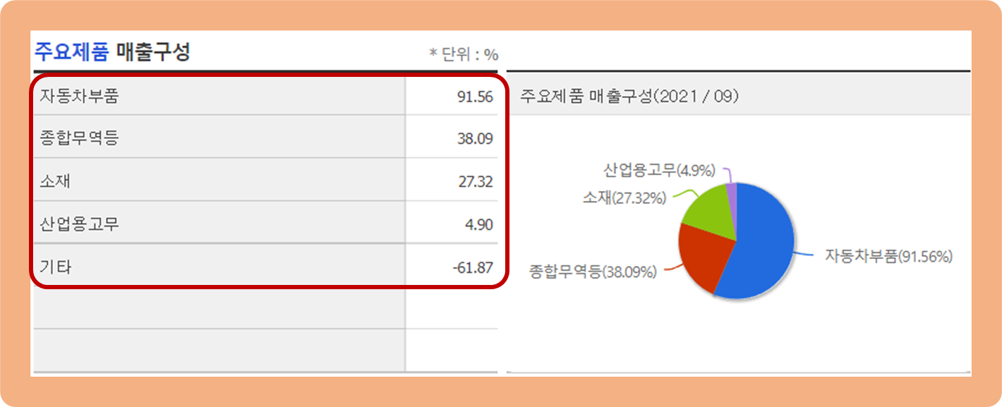 우선, 자동차 부품 부문이 약 91.6%를 차지하며 매출 대부분을 책임지고 있구요.