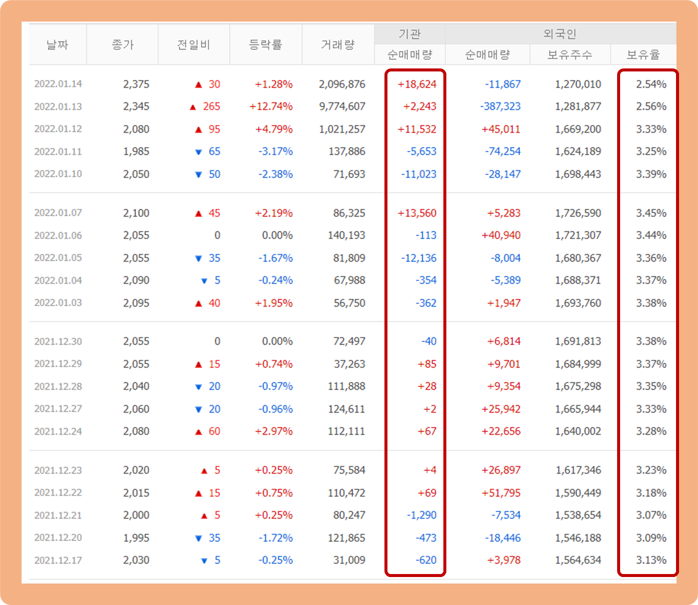 우선 기관투자자의 경우, 최근 들어 매수세가 집중되고 있는 모습이구요.
