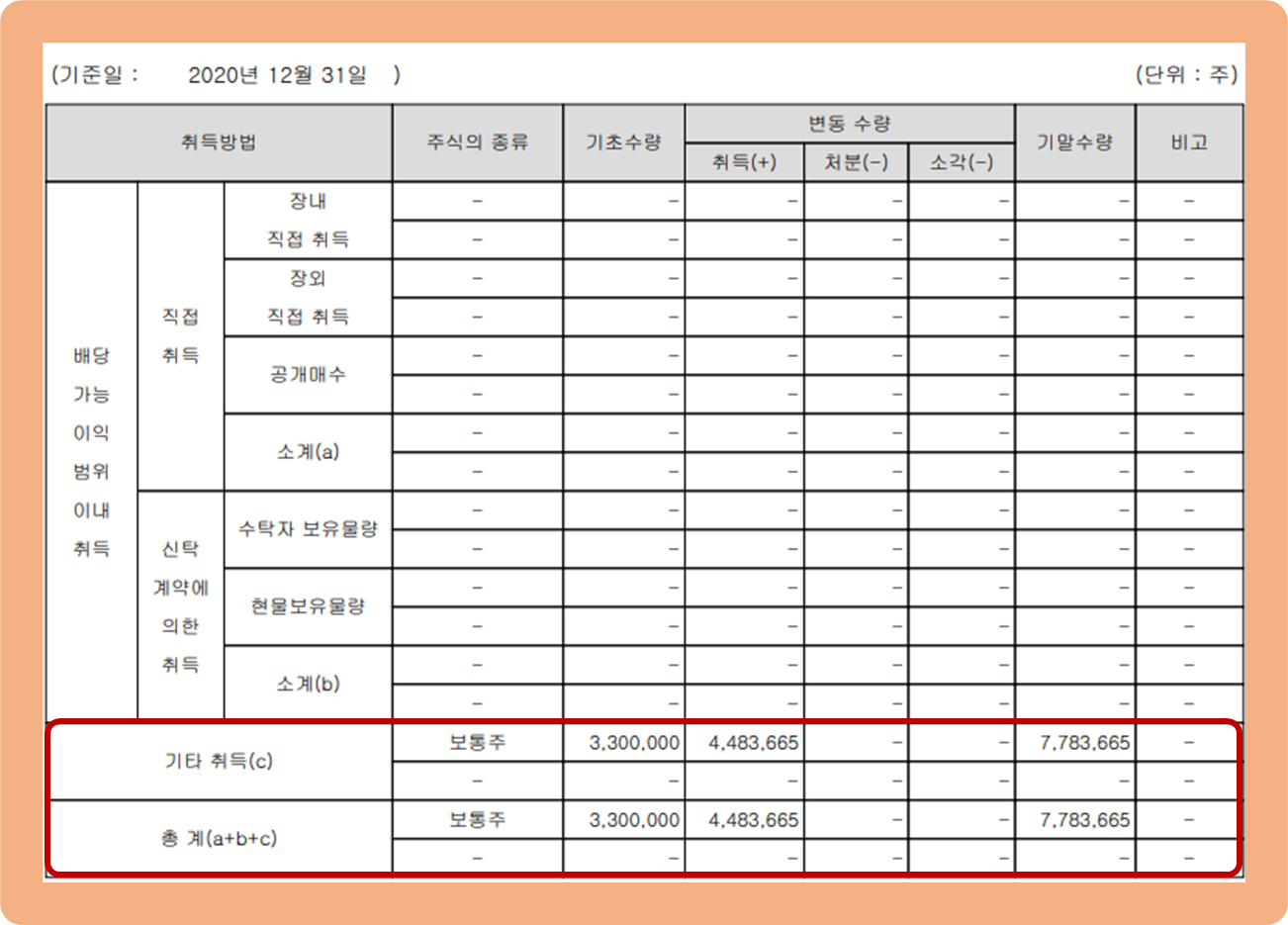 지난 2020년 12월 기준 자사주 취득 및 처분 현황을 보겠습니다.