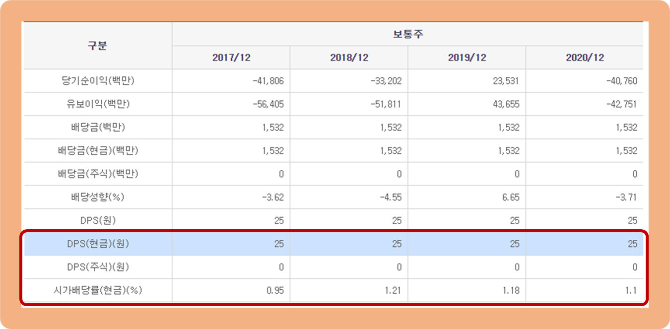 지난 2017년, 2018년, 2019년, 2020년 모두 1주당 25원의 배당금이 지급되었으며, 배당수익률은 약 1% 내외 수준을 유지하고 있습니다.