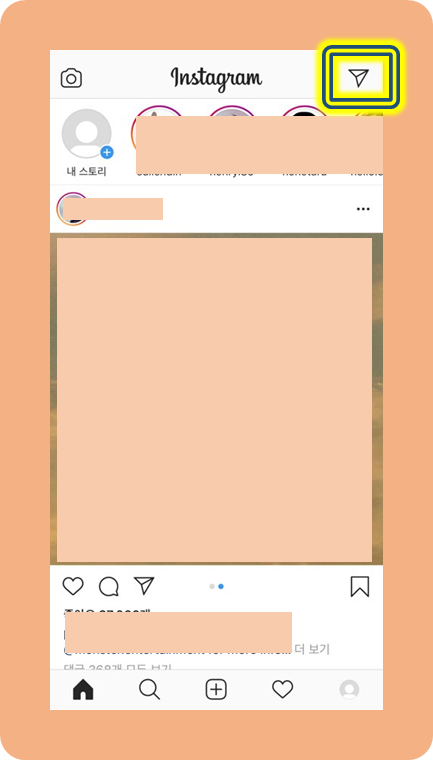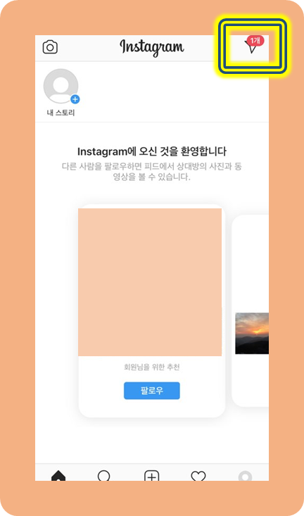 우선 인스타그램 홈에서 오른 쪽 위에 아무런 표시가 되어있지 않죠?