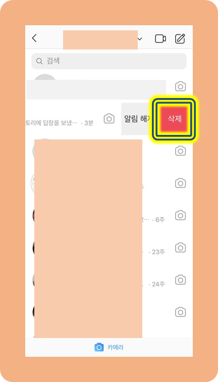 여기서 삭제를 원하는 메세지에 손가락을 올린 후, 왼쪽으로 화면을 밀어주세요~