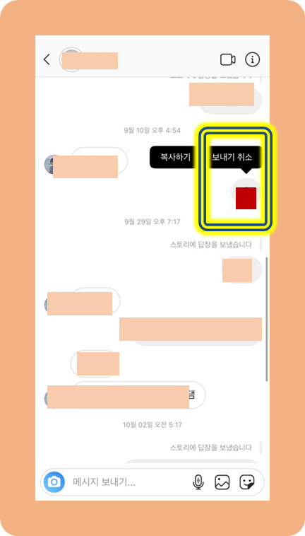 그렇게 꾹 눌러주셨으면, 왼쪽 사진처럼 보내기 취소 아이콘이 나타나는데요.