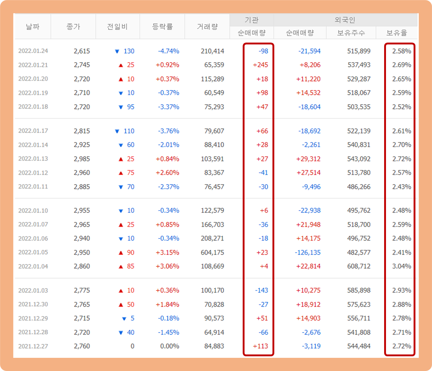 우선 기관투자자의 경우, 거래량이 거의 없는 상태이며 매수세가 더 많은 모습이네요.