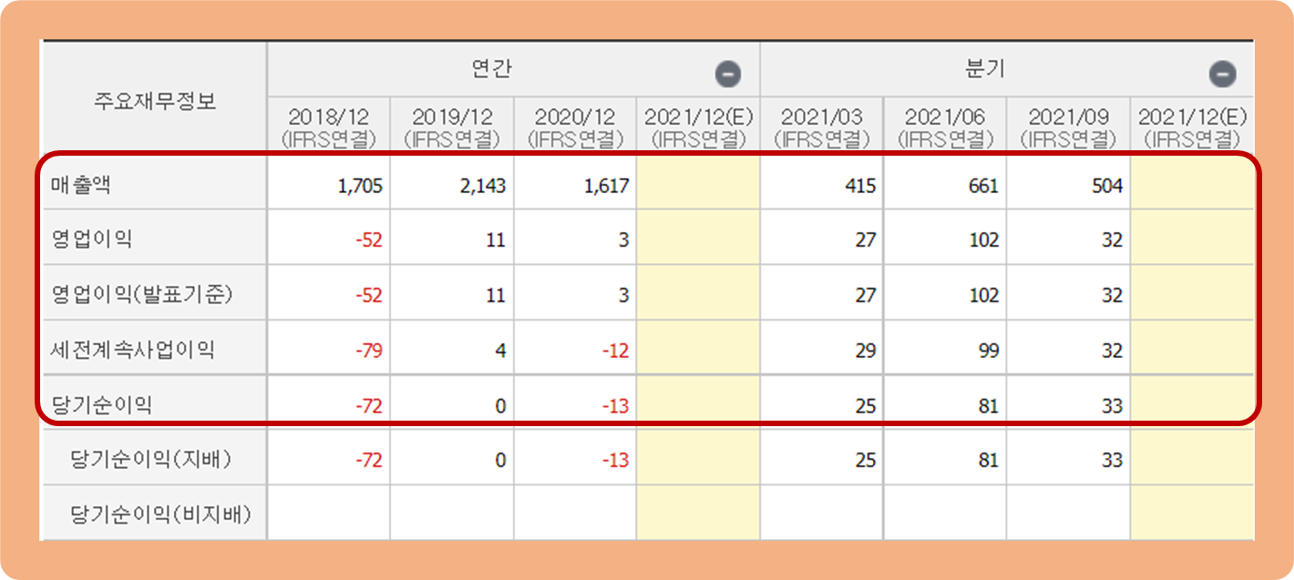 지난 2020년 기준 연간 매출액과 영업이익은 각 1,617억원, 3억원을 기록했었구요.