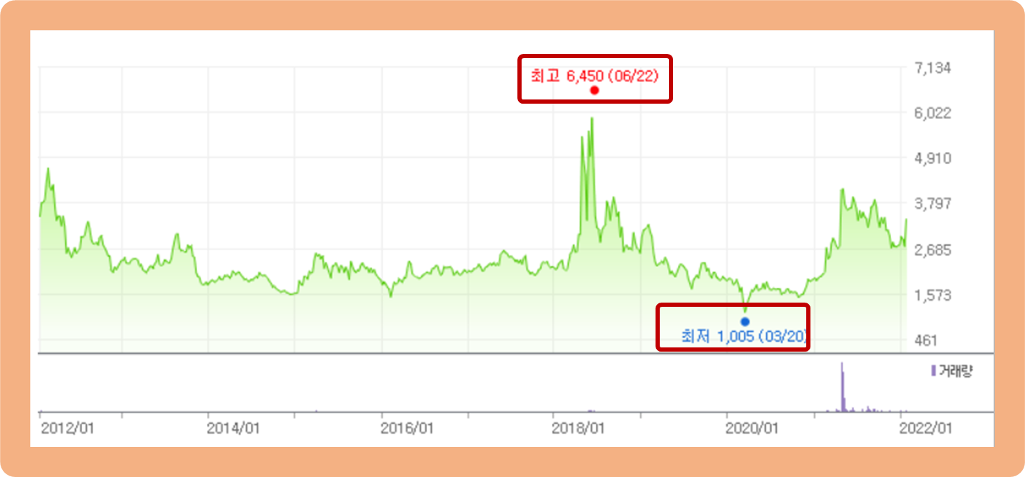 최고가는 2018년 6월에 기록한 6,450원이며, 최저가는 2020년 3월에 기록한 1,005원이네요.