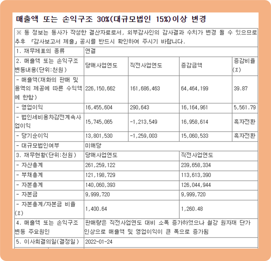 2022년 1월 24일, 하이스틸이 매출액 및 손익에 관한 공시를 발표했는데요.