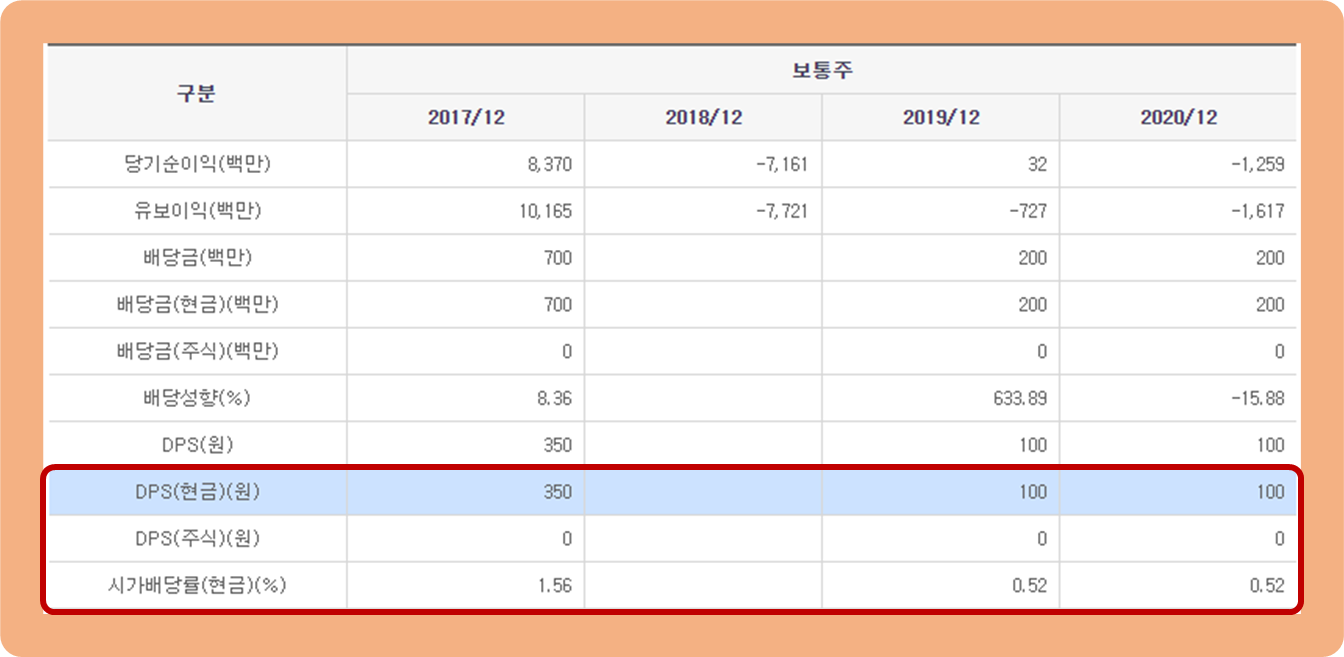 2017년 : 350원, 2019년, 2020년 : 100원의 주식 배당금을 지급해오고 있으며, 배당수익률은 약 1% 내외 수준입니다.