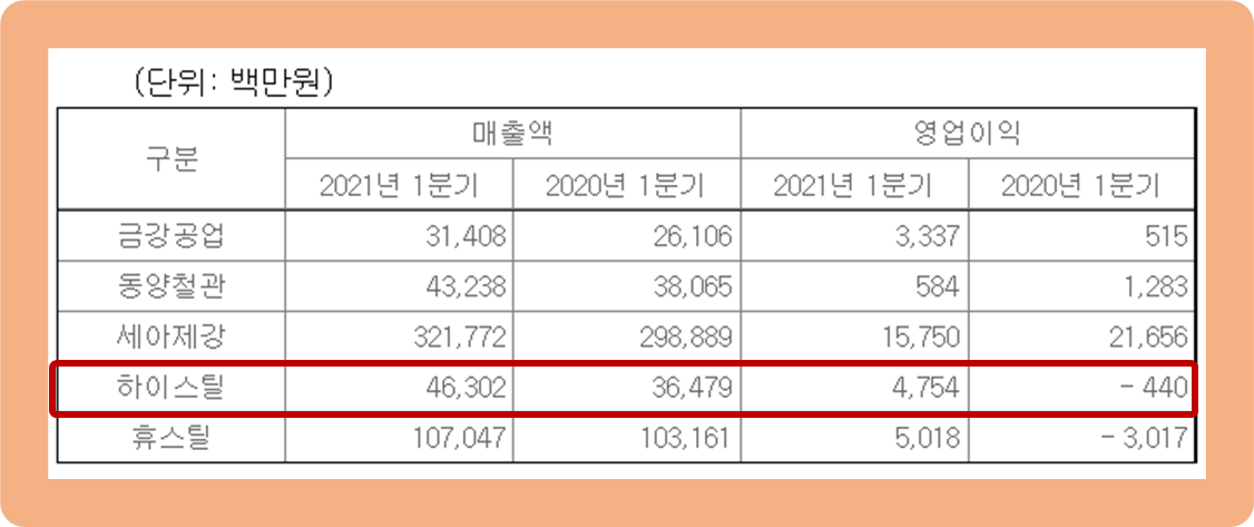 2021년 1분기 기준으로 하이스틸은 매출액과 영업이익 각 463억원, 47억원을 기록했구요.