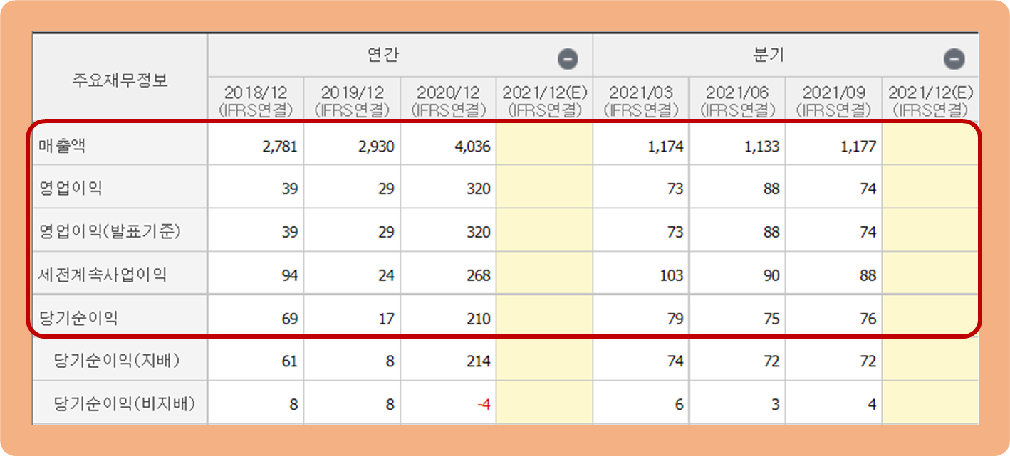 2020년 기준 연간 영업이익과 당기순이익은 각 320억원, 210억원을 기록하면서 전년 대비 무려 각 1000%, 1130% 상승했네요.
