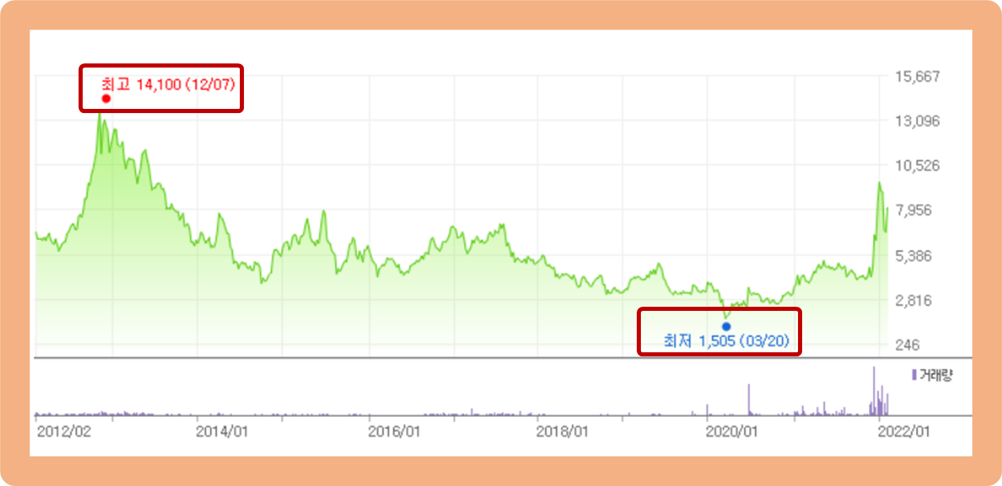 최고가는 지난 2012년 12월에 기록한 14,100원이며, 최저가는 2020년 3월에 기록한 1,505원이네요.