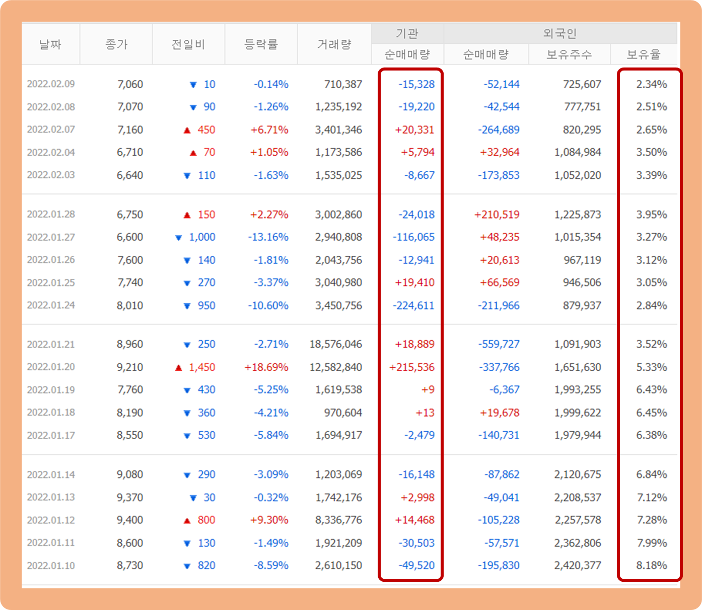 먼저 기관투자자의 경우, 지난 한 달 동안 매도세가 매수세에 비해 우위를 점하고 있구요.