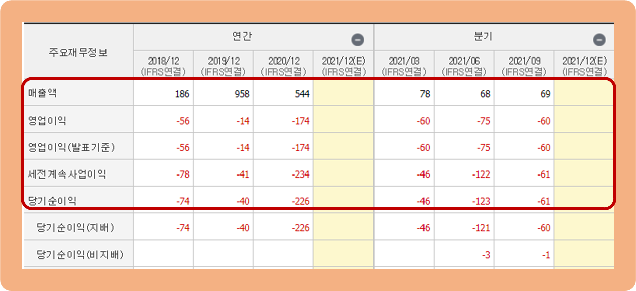 그리고 2021년 3분기 기준 누적 영업이익과 당기순이익이 각 -195억원, -230억원 손실을 기록 중인 바, 아쉽지만 2021년 연간 실적도 적자를 이어나갈 것으로 보입니다.