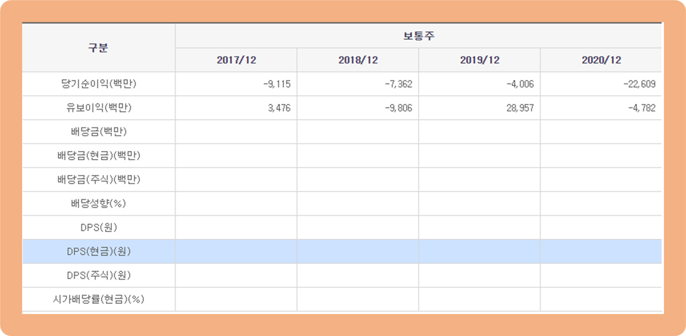 이 기업은 현재 주식을 보유하고 있는 주주분들에게 주식 배당금을 지급하지 않고 있네요.