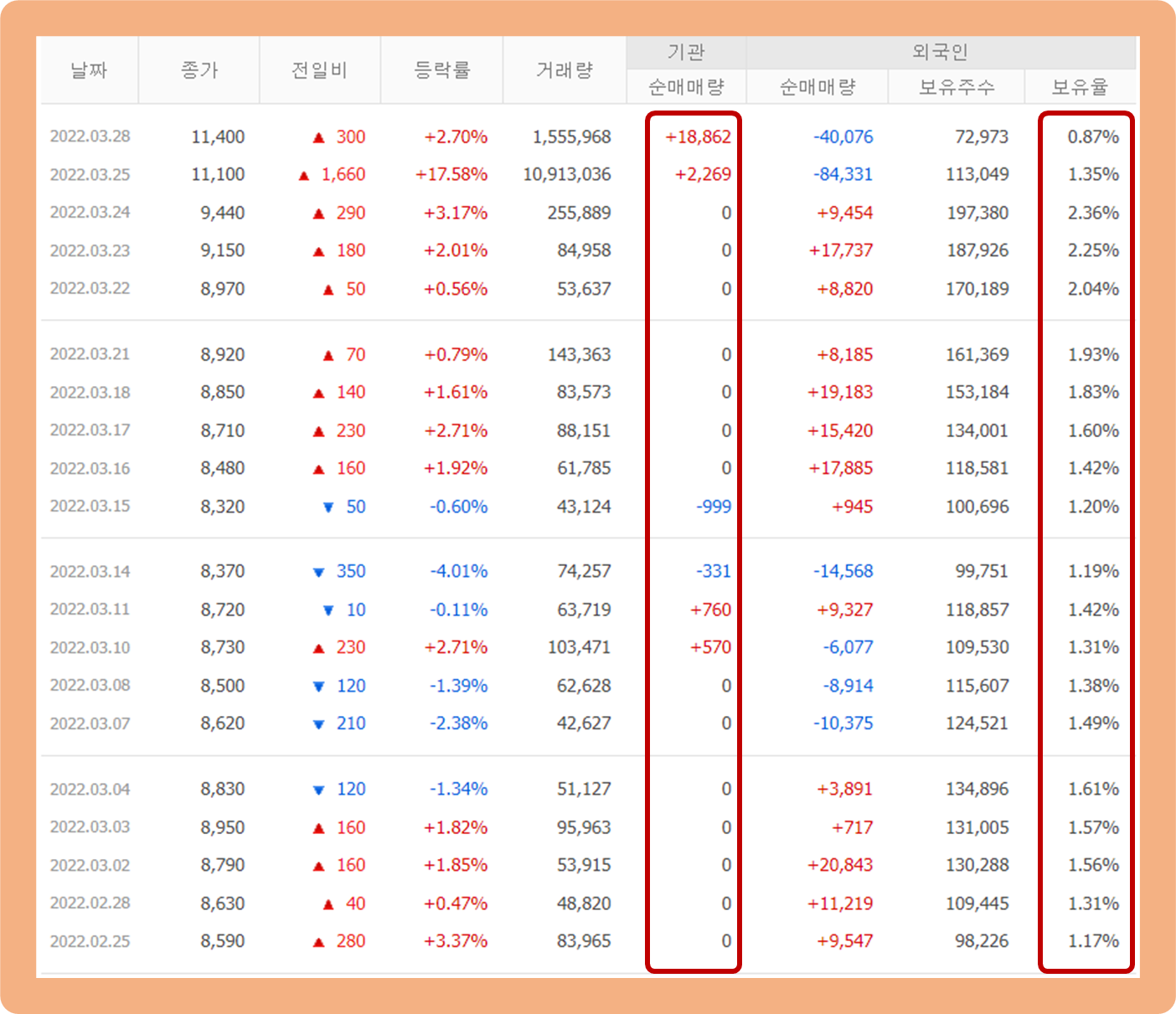 우선 기관투자자의 경우 최근 급격히 매수세가 증가한 모습이구요.