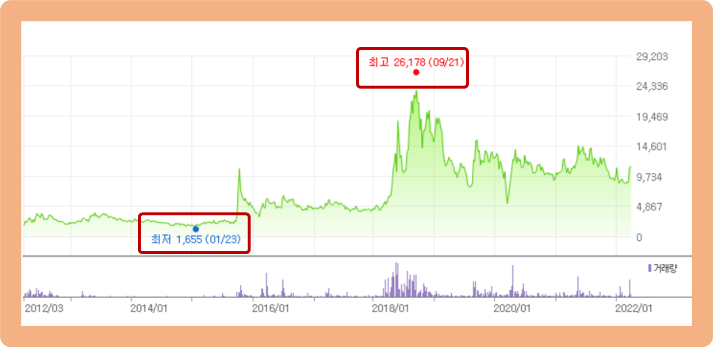 지난 10년 동안 푸른기술의 주가 변동 추이를 보도록 하겠습니다. 최저가는 지난 2015년 1월에 기록한 1,655원이며, 최고가는 지난 2018년 9월에 기록한 26,178원이네요.