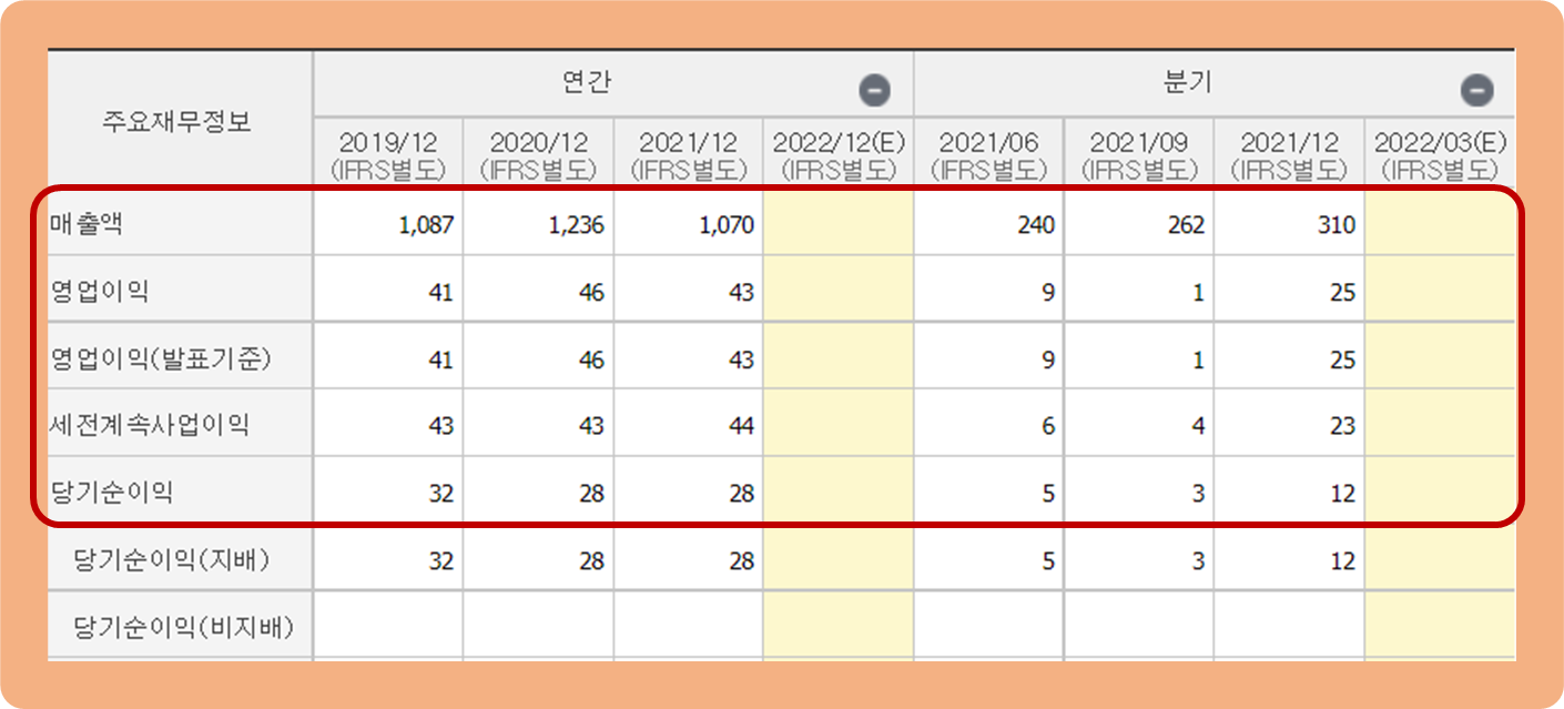 2021년 기준 연간 영업이익과 당기순이익은 각 43억원, 28억원을 기록하며 전년도와 유사 수준을 유지하고 있는 모습이네요.