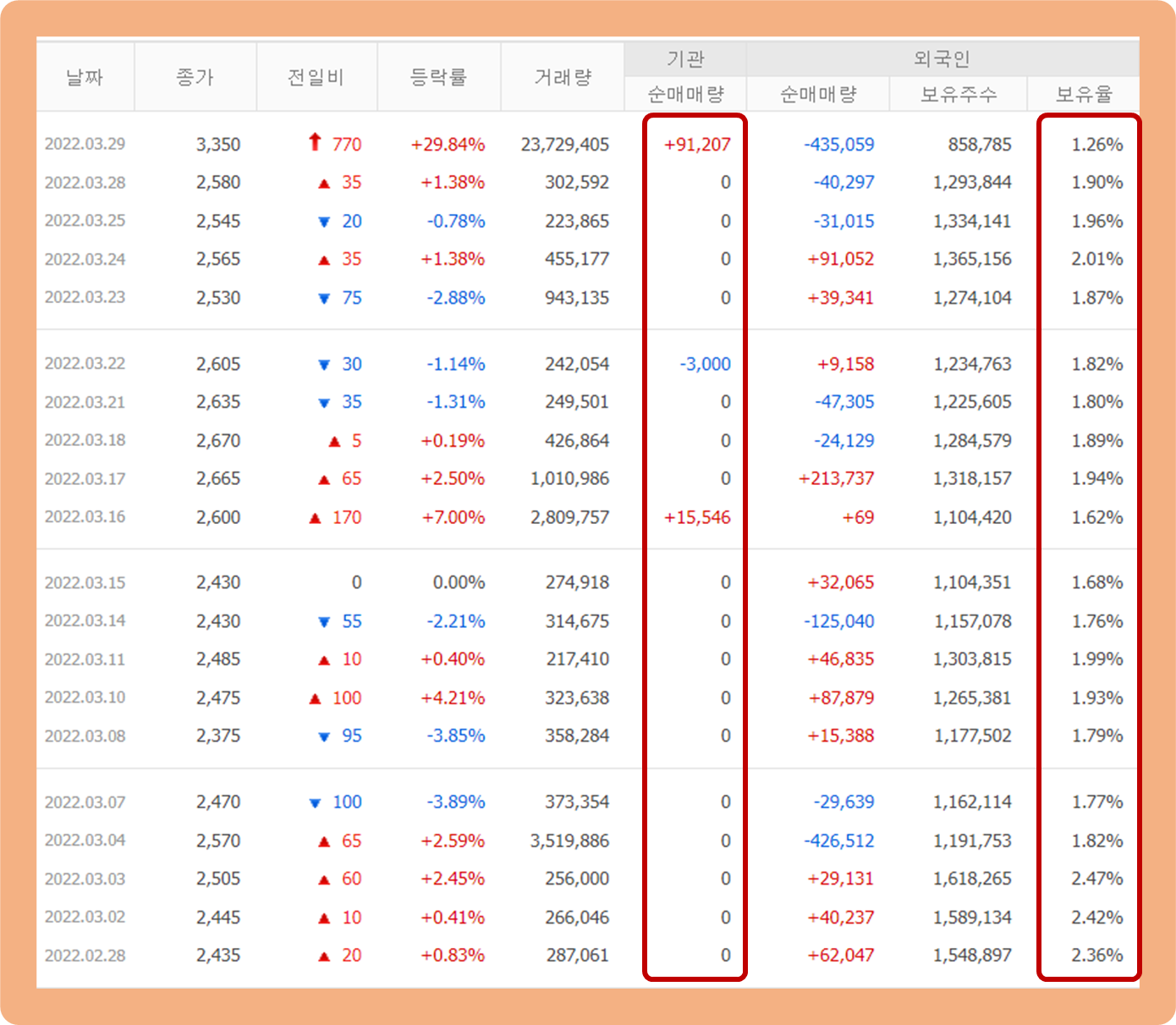 우선 기관투자자의 경우, 지난 한 달 동안 거래량이 거의 없었으며 단 2거래일 동안 매수세가 크게 들어온 모습이구요.