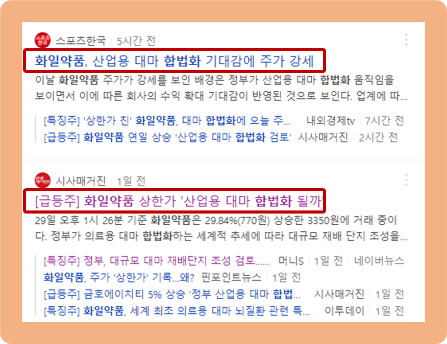 향후 국내 마리화나 관련 제품의 입법화가 성공할 경우 식의약품, 의료용 치료제 등에 접목할 계획임을 밝힌 바 있죠.