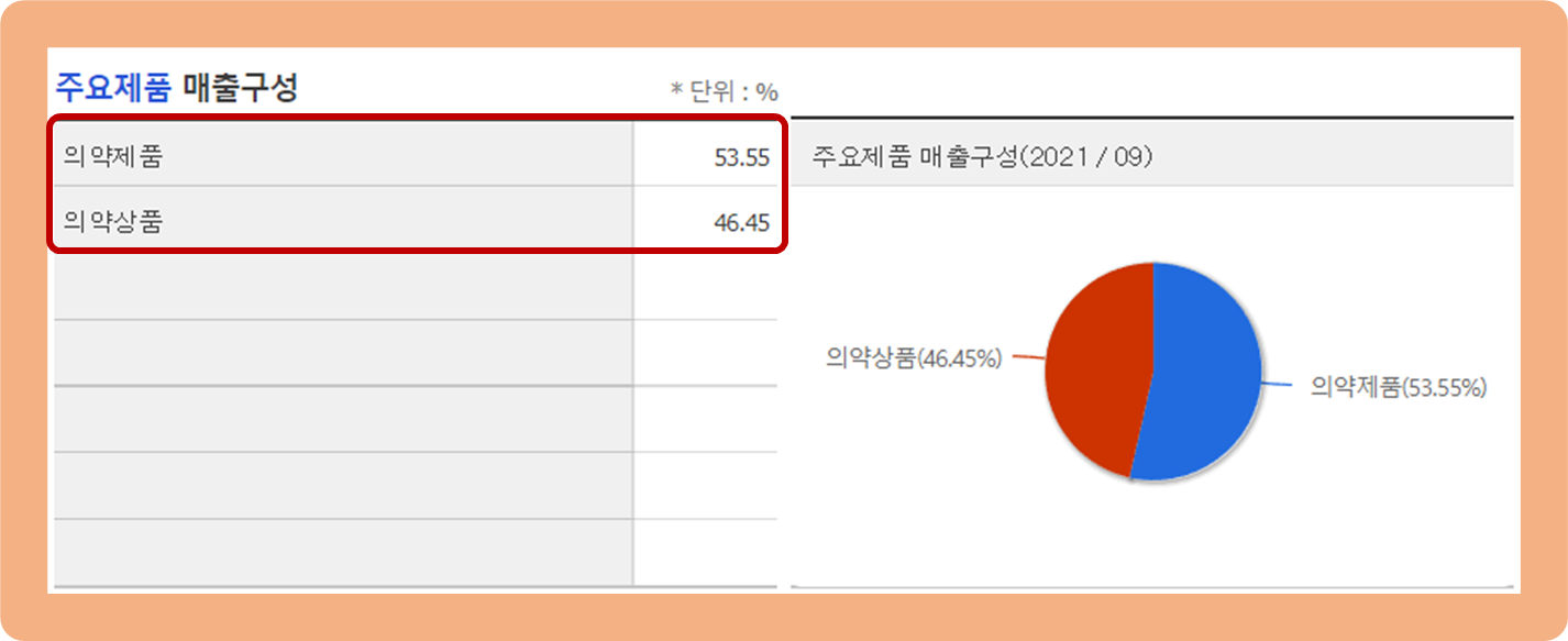 우선, 의약 제품 부문이 약 53.5%를 차지하고 있는데요.