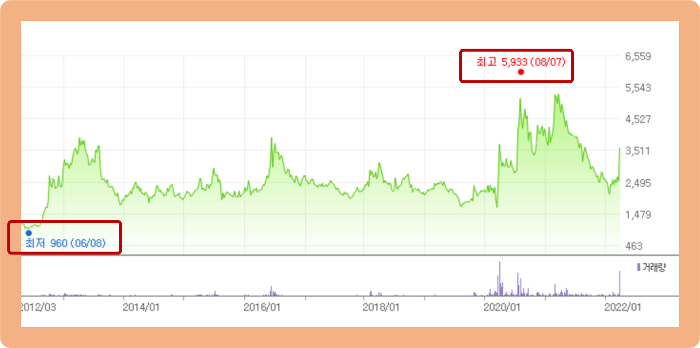 최저가는 2012년 6월에 기록한 960원이며, 최고가는 2020년 8월에 기록한 5,933원입니다.