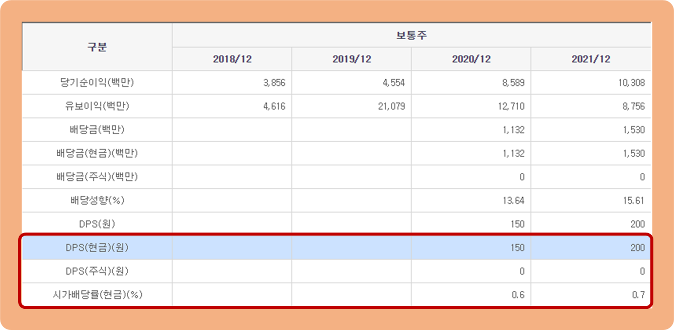 지난 2020년 기준으로 1주당 150원의 배당을 실시했으며, 그 다음해인 2021년도에는 1주당 200원의 배당을 실시했네요.