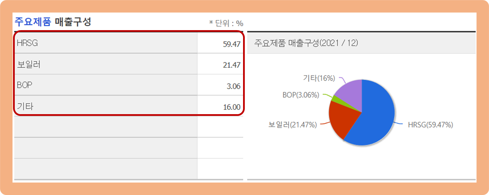 우선, HRSG(배열회수보일러) 부문이 약 59.5% 수준으로 총 매출의 과반 이상을 차지하고 있구요.
