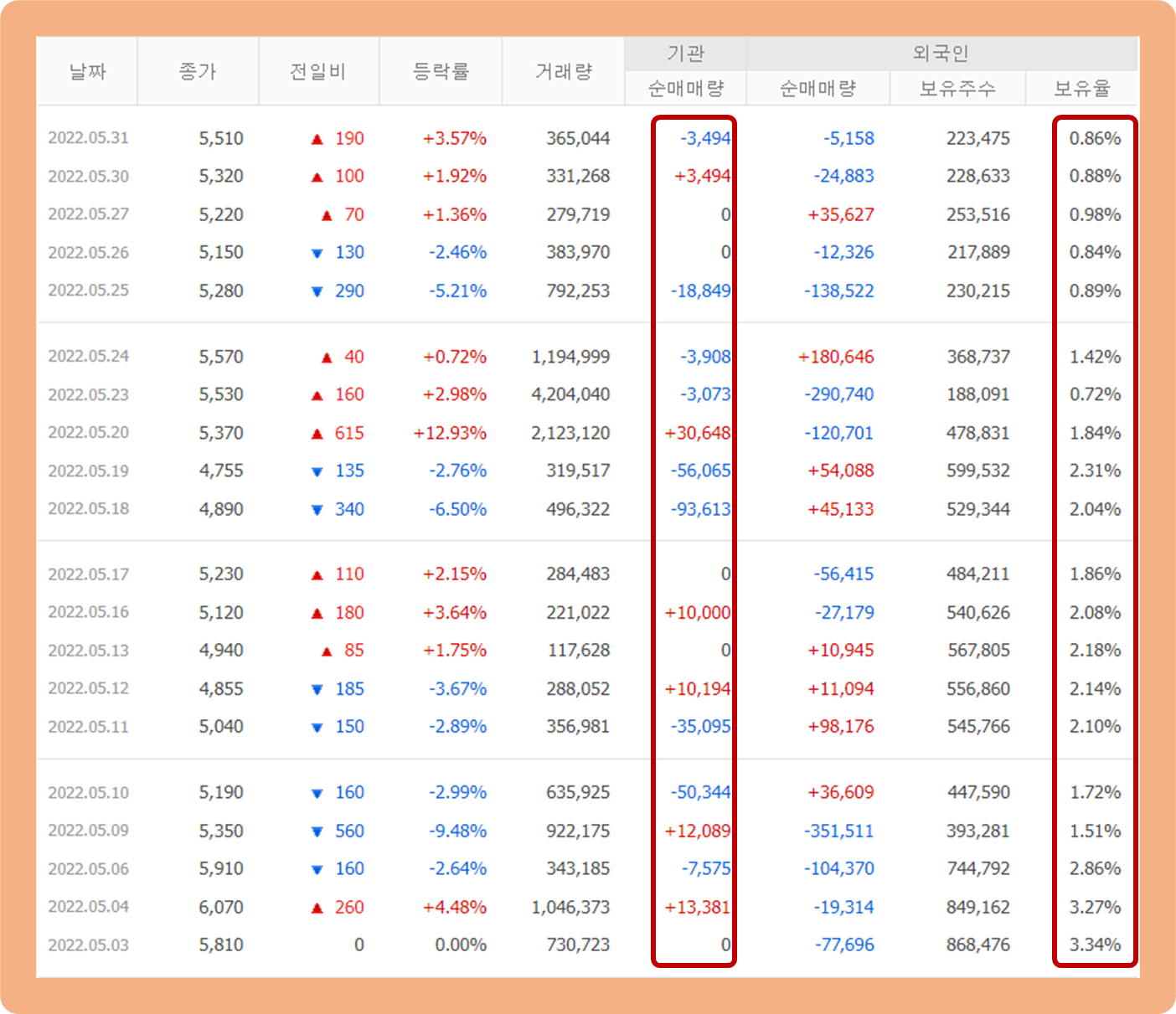 기관 및 외국인 투자자 모두 매도세가 집중되고 있습니다.