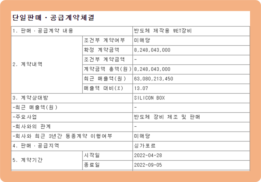 싱가포르에 위치한 실리콘박스 기업과 반도체 제작용 습식 장비 공급에 관한 계약을 체결한 것인데요.