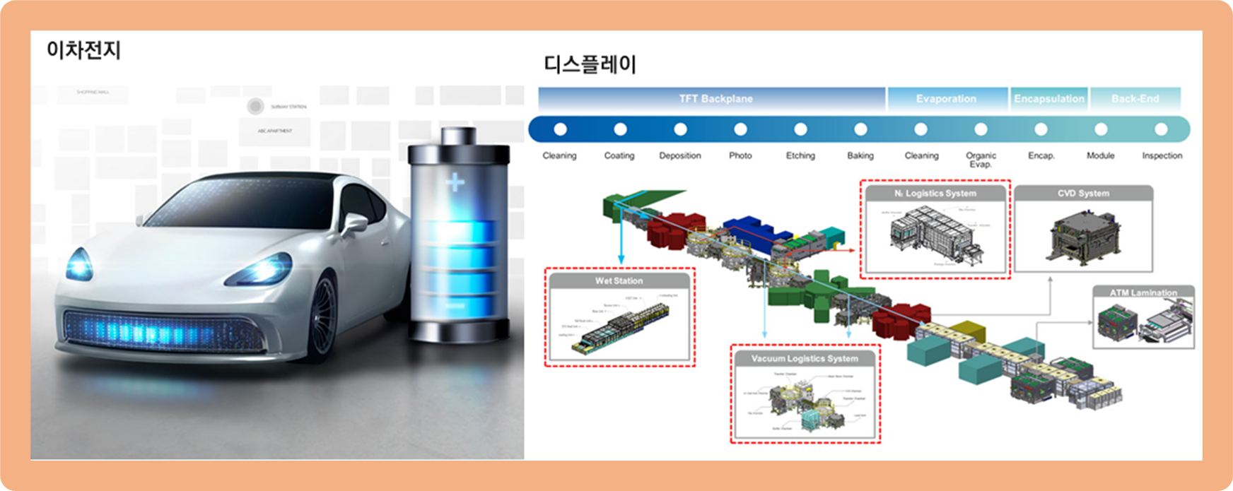 디스플레이 장비로는 Wet Station 장비 및 이송장비, 진공장비 등을 제조하고 있으며, 주요 고객기업으로는 LG디스플레이와 중화권 기업들이 있습니다.