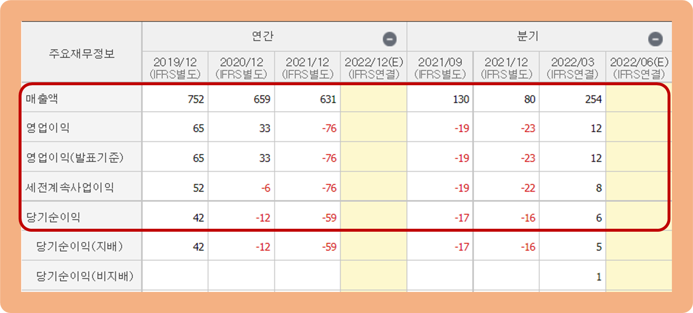 그리고 2021년 기준 연간 영업이익과 당기순이익은 각 -76억원, -59억원 손실을 기록하며 적자를 기록하고 있는데요.