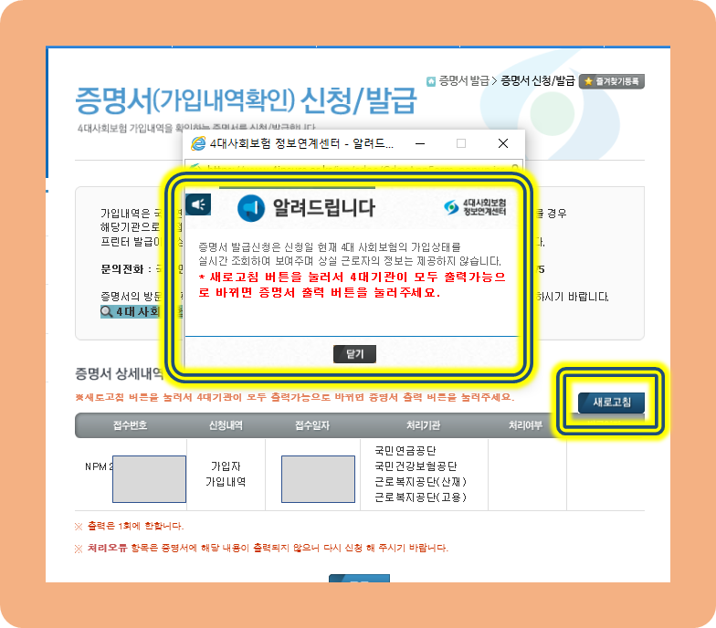 4대 기관 모두 새로 고침 버튼을 눌러 출력 가능으로 변경해야 된다는 안내문이다.