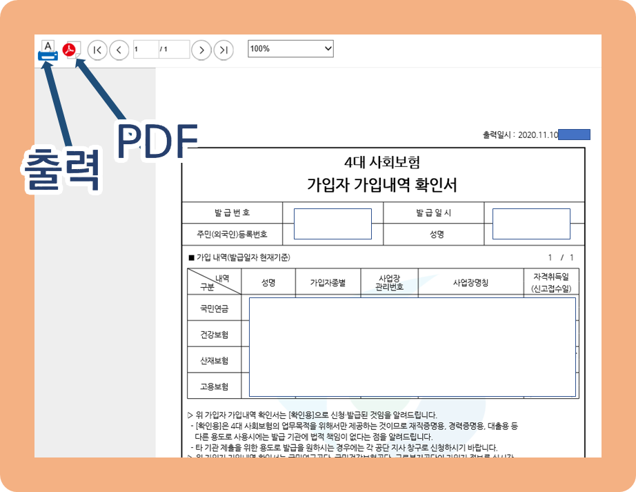 이제 출력을 클릭하여 4대 보험 가입 증명서를 확인해보자.