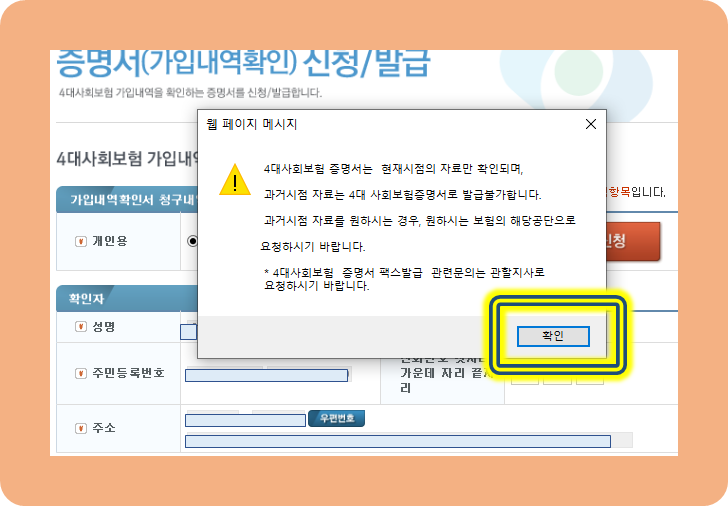 하지만 우리는 확인서를 발급받으려는게 목적이므로 상단에 보이는 확인을 클릭한다.