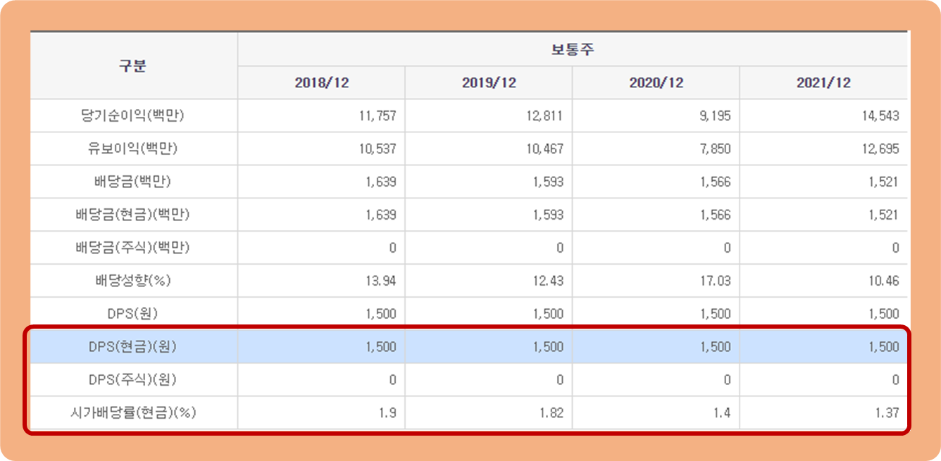 2018년, 2019년, 2020년, 2021년 모두 1주당 1,500원이 배당을 실시한 바 있습니다.