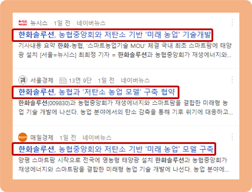 2022년 7월 5일, 한화솔루션이 농협중앙회와 저탄소 스마트 농업 기술 등에 관한 업무협약을 체결했습니다.