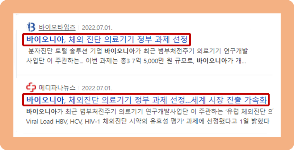 2022년 7월 1일, 범부처전주기 의료기기 연구개발사업단이 추진하는 "유럽 체외진단 의료기기 체외 진단 시약 유효성 평가" 과제에 바이오니아가 선정되었다는 소식이 발표되었습니다.
