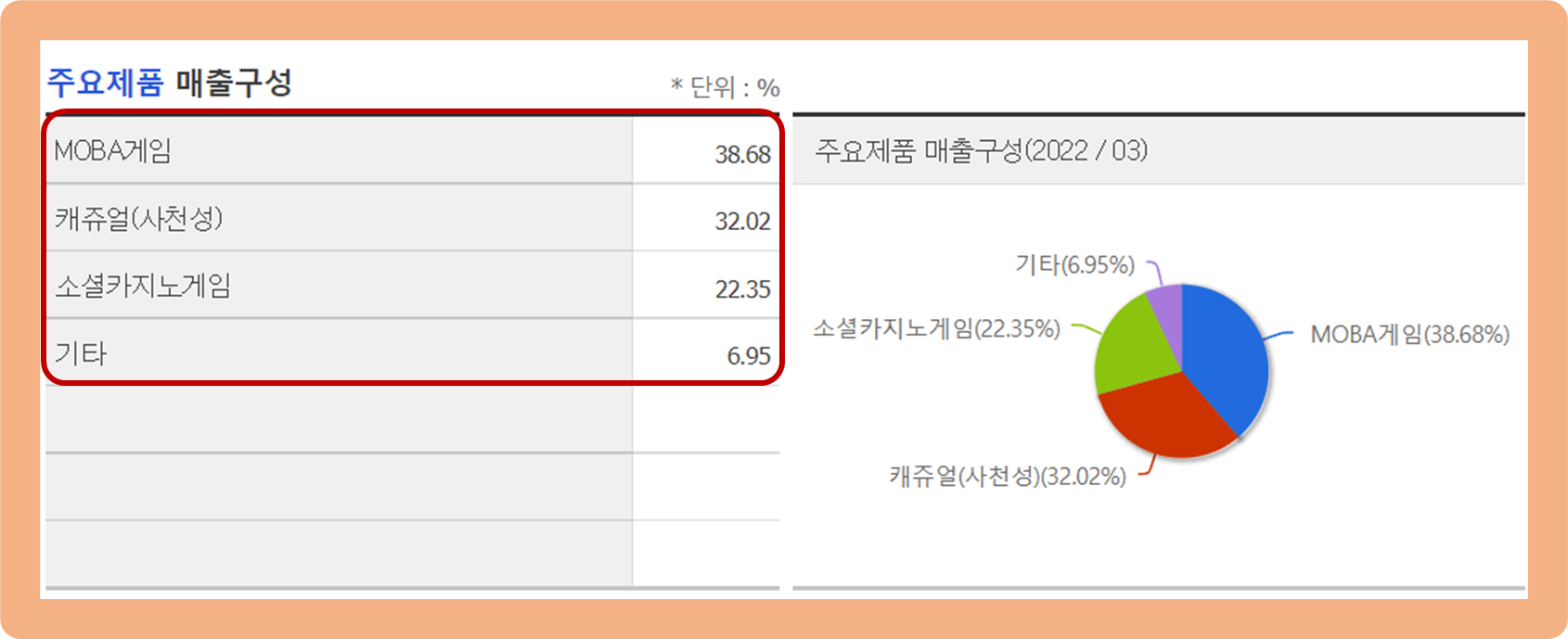 그 다음으로 캐쥬얼 부문 약 32.0%, 소셜 카지노 부문 약 22.4% 순이네요.