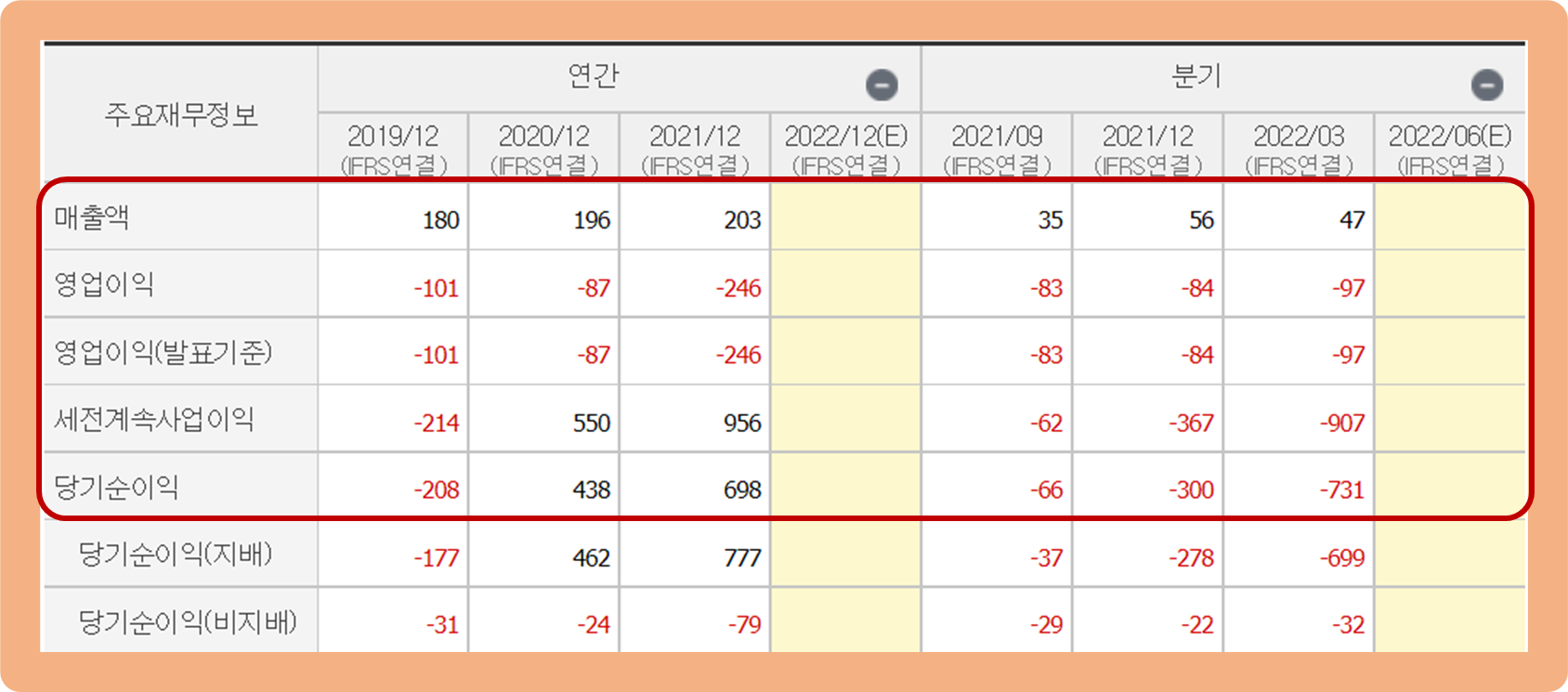 그리고 연간 영업이익은 2019~2021년 3년간 모두 적자를 이어오고 있으며, 2021년 기준 -246억원 손실을 기록하며 전년 대비 적자 폭이 더 커진 상황이구요.
