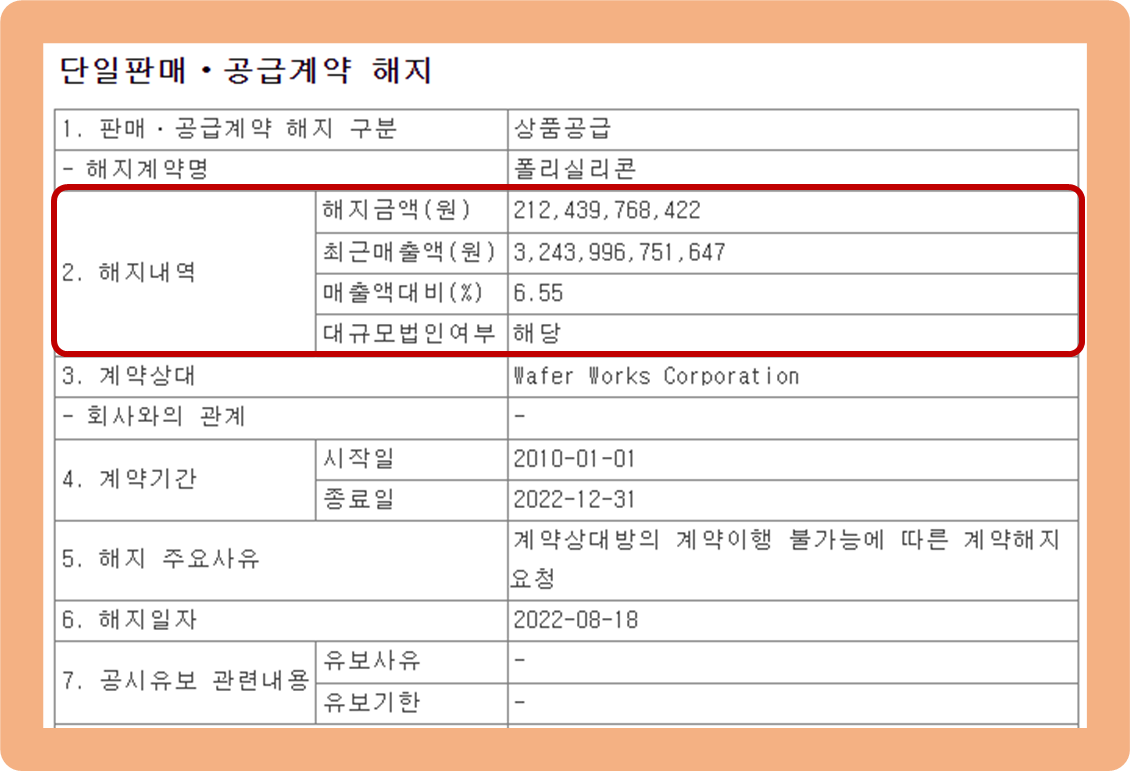 2022년 8월 18일, OCI가 Wafer Works Corporation과 체결한 폴리실리콘 공급 계약이 해지되었다는 공시를 발표했습니다.