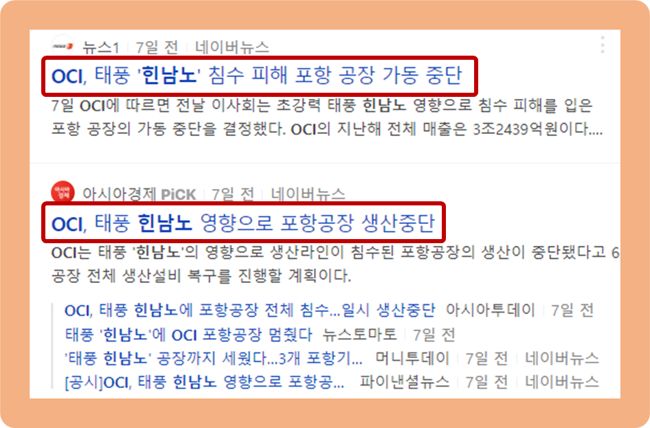 2022년 9월 6일, OCI가 태풍 힌남노로 인해 생산라인이 침수된 포항공장이 중단되었다는 공시를 발표했습니다.