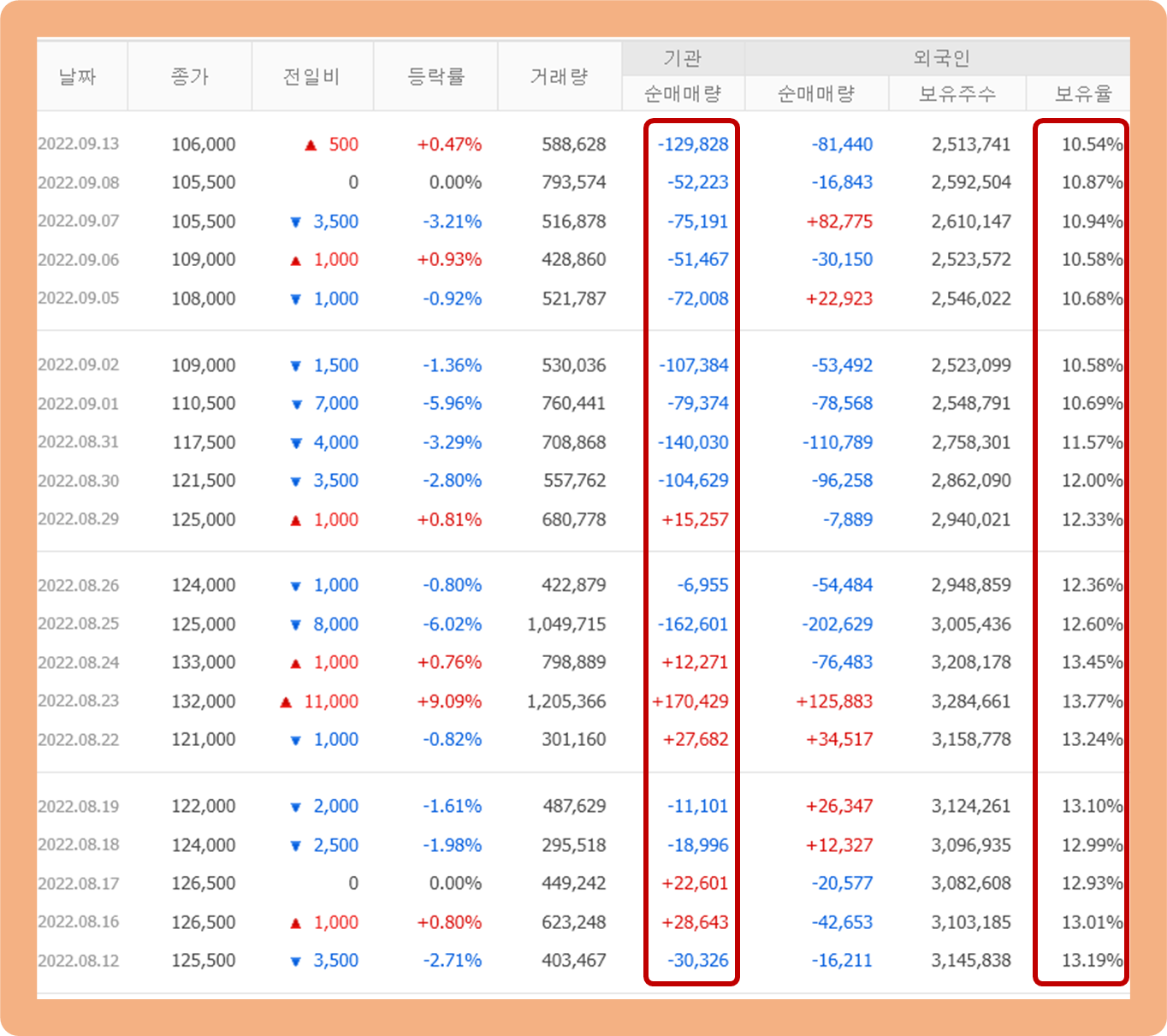 지난 1개월간 기관 투자자 및 외국인 투자자 주식 거래 추이에 대해 살펴보도록 하겠습니다.