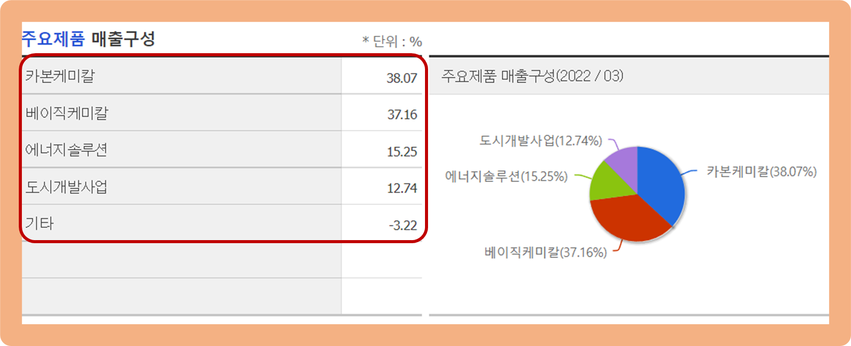 우선 카본케미칼 부문이 약 38.1%로 가장 많은 비중을 차지하고 있구요.