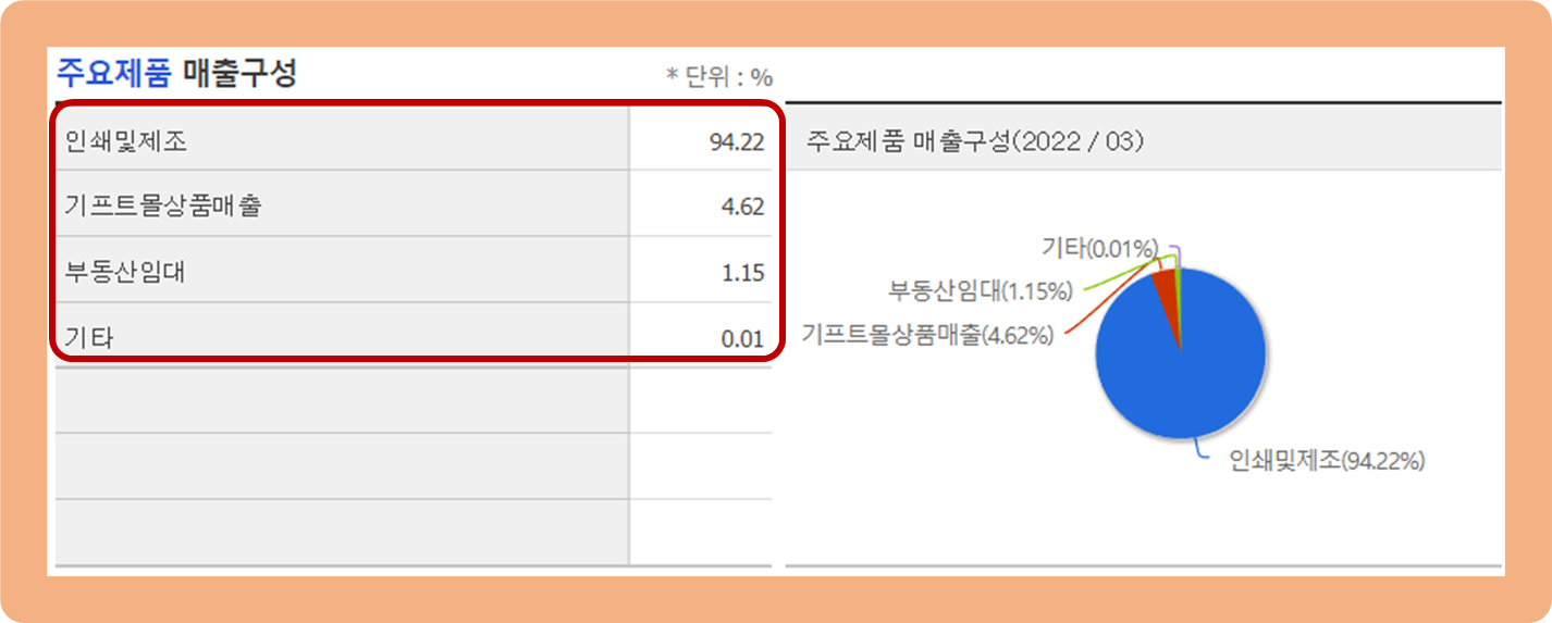 우선 주력 사업인 인쇄 및 부문이 약 94.2% 수준으로 총 매출의 대부분을 책임지고 있구요.